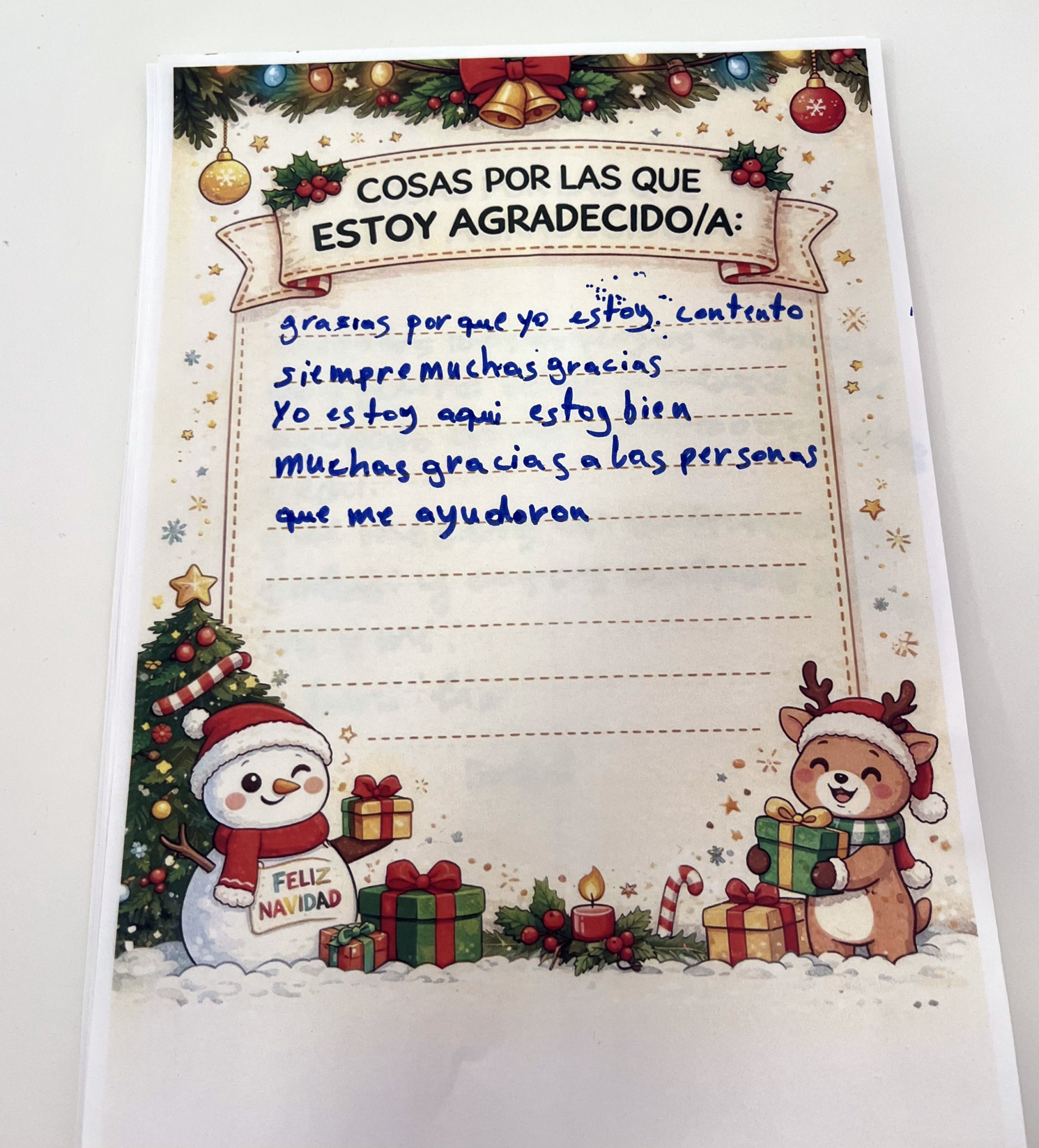 Tras la lectura, los chicos participaron de forma activa escribiendo cartas de gratitud, en las que expresaron por qué se sentían agradecidos. En estos textos plasmaron pensamientos y sentimientos personales, reflexionando sobre personas, experiencias y situaciones que forman parte de su vida y que les aportan bienestar, calma y motivos para seguir avanzando.