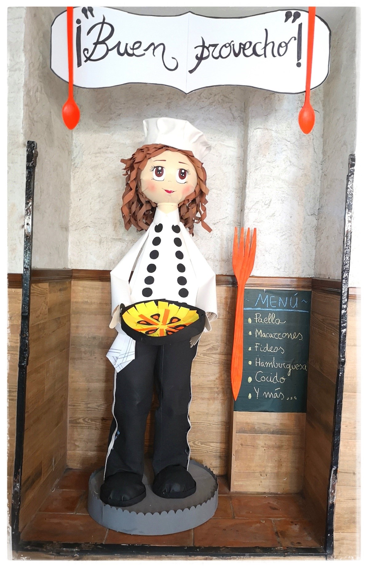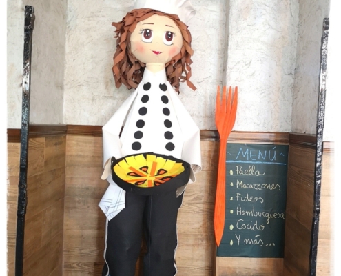 Y el resultado final es el siguiente: una gran cocinera que ha entusiasmado a los más pequeños, y que hemos aprovechado para tematizar este rincón simulando un restaurante.  Así de bonita ha quedado la cocinera, que nos presenta su paella recién hecha.