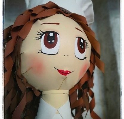 La cabeza se realiza con una esfera de poliestireno. Se le hace el pelo rizado con goma eva marrón y el gorro de color blanco.
