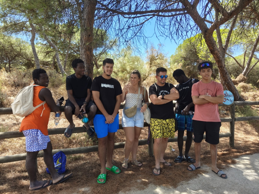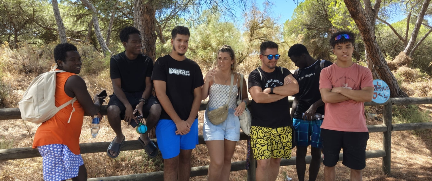 Jóvenes del programa recorren un sendero de 3 km entre pinos y dunas en el paraje de Los Enebrales (Huelva), afianzando lazos con sus compañeros y educadores mientras aprenden sobre la flora y fauna autóctona.