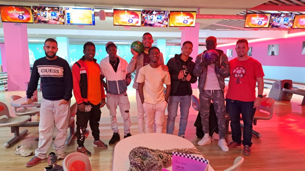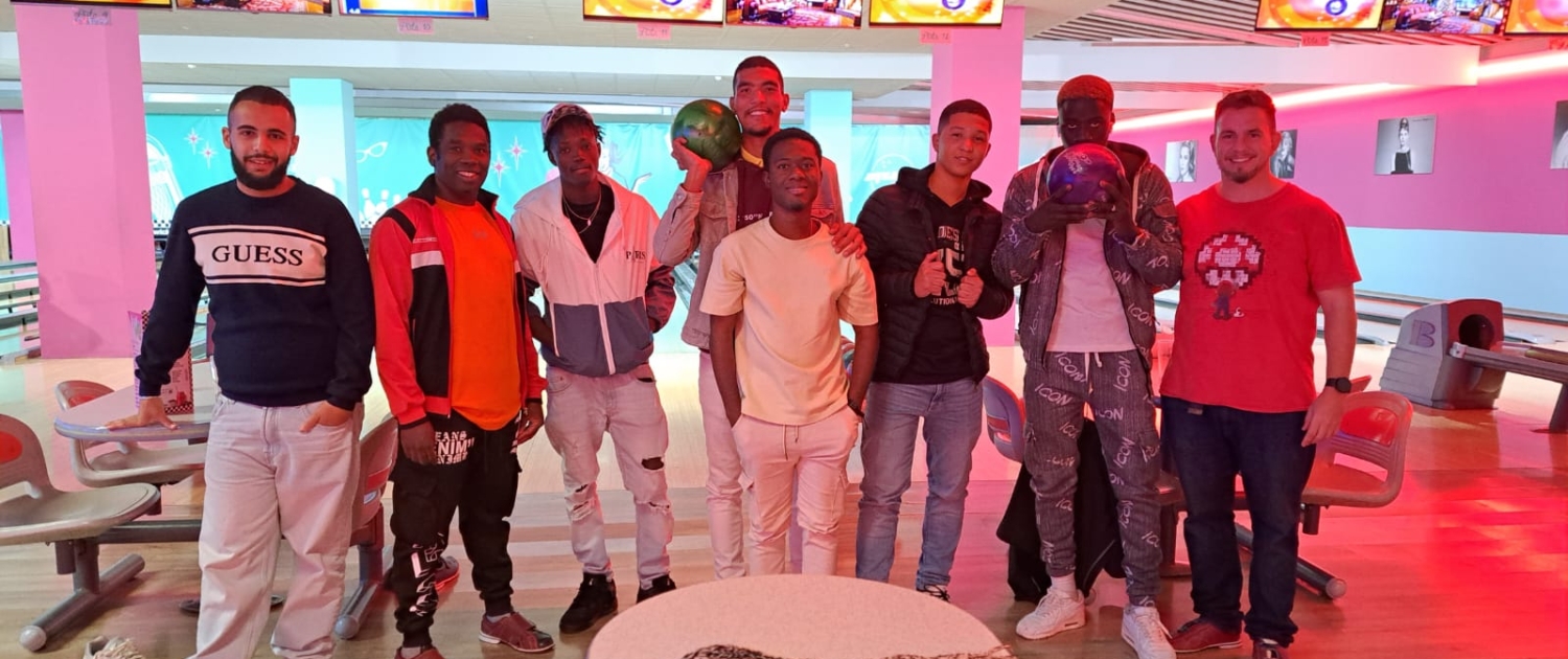 Los y las jóvenes del programa JEM+18, gestionado en Huelva por Asociación Engloba, participan en una jornada de convivencia y ocio saludable en una bolera dentro del programa “Tratamiento psicosocial y sanitario de jóvenes migrantes con adicciones con y sin sustancias”.