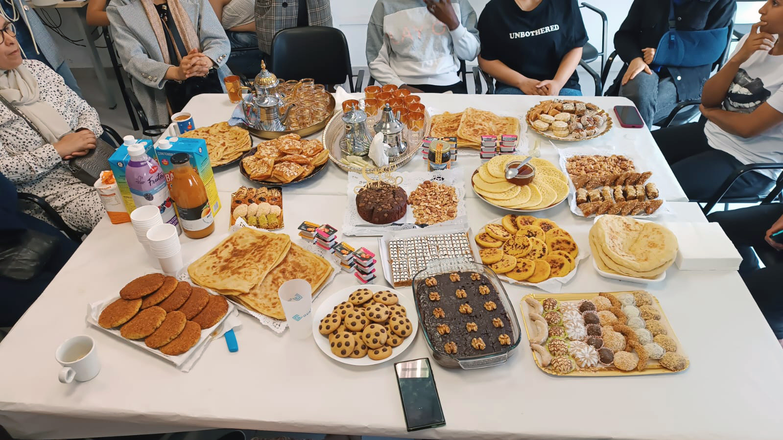 Platos caseros elaborados por las propias participantes: dátiles rellenos, chebakias, batbout, baghrir, té moruno, entre otros.