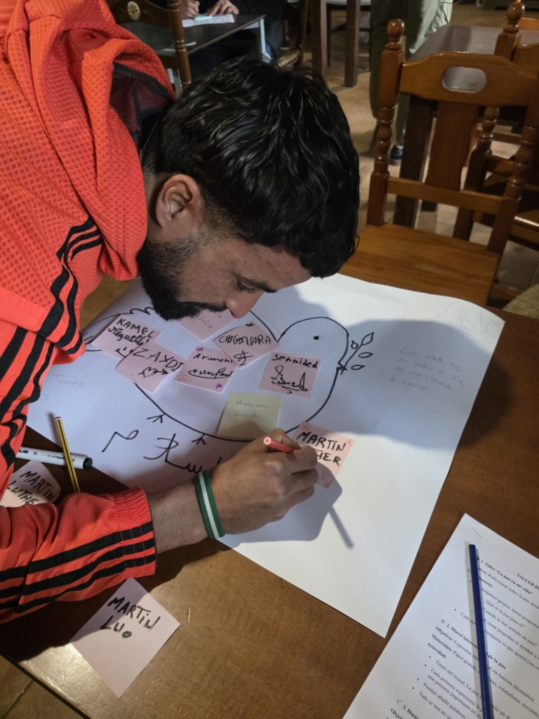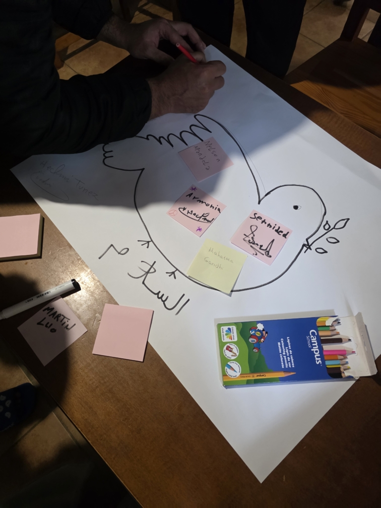 Por último, la actividad finalizó con “Música y palabras del mundo”, un espacio para conectar culturas a través de canciones, refranes y palabras relacionadas con la paz en distintos países. De esta dinámica surgió una lista común y un pequeño “diccionario de la paz”, que sirvió para compartir identidades, fortalecer el sentimiento de pertenencia y celebrar la diversidad como un valor.