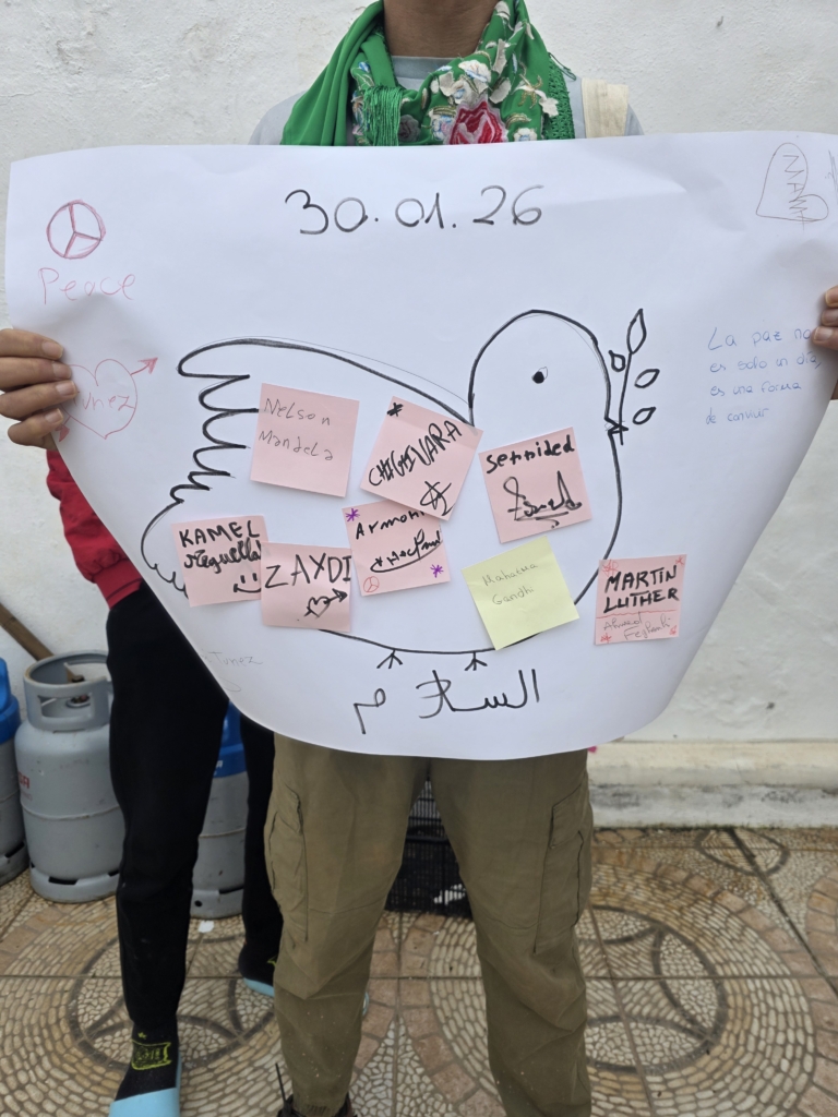 A continuación, se realizó el Mural Intercultural de la Paz, una propuesta creativa sin barreras idiomáticas que facilitó la participación de todo el grupo. A través de dibujos, símbolos, colores, palabras en lengua materna y referencias a personas que han promovido la paz, los chicos construyeron de manera colectiva un gran mural bajo el lema “La paz no es solo un día, es una forma de convivir”, que quedará expuesto en el centro como símbolo visible de unión, diversidad y convivencia.