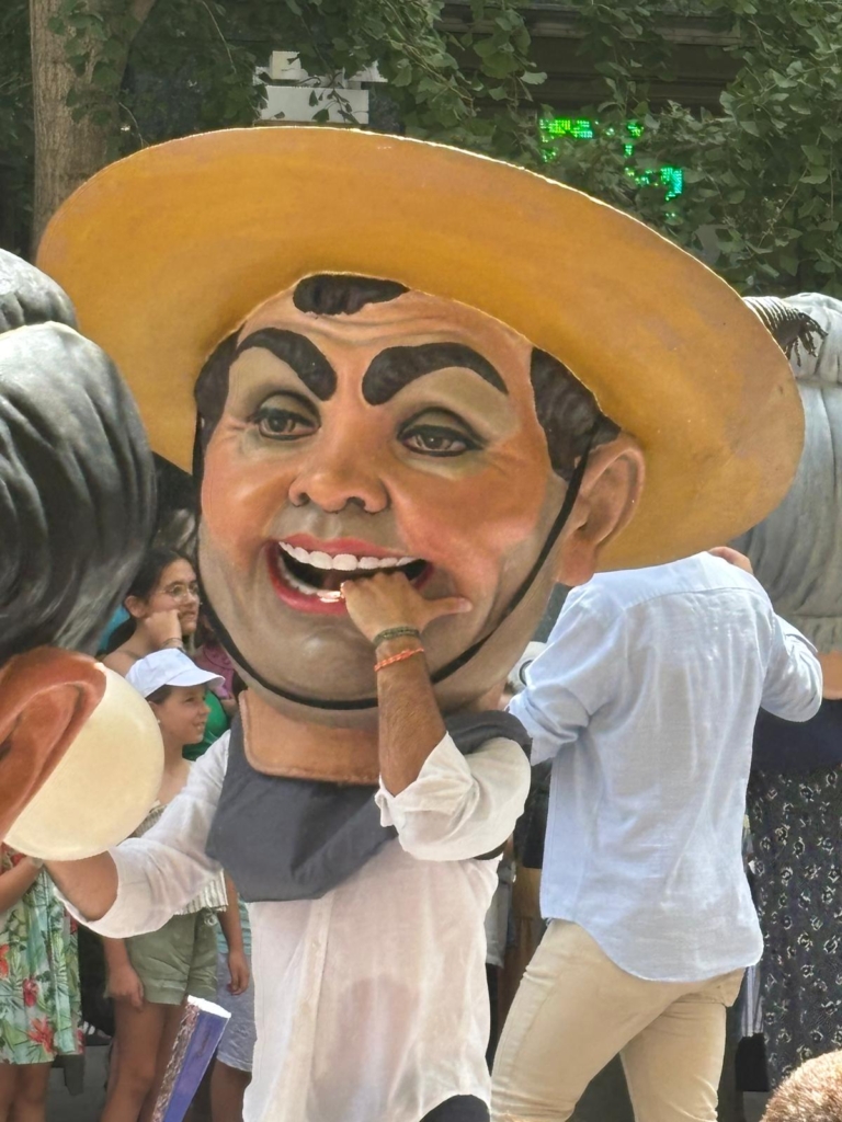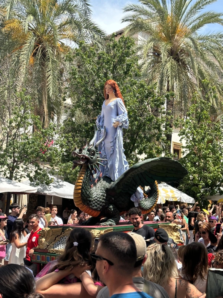 La jornada comenzó con la contemplación de la mítica figura femenina montada sobre un dragón —vestida con las últimas tendencias de moda— que abre cada año el Corpus granadino. Junto a ella, los cabezudos y los gigantes animaron las calles al ritmo de la música y los aplausos del público. Posteriormente, el grupo visitó las carocas de la plaza Bib-Rambla, paneles satíricos que recogen en quintillas los sucesos más comentados de la actualidad local.
